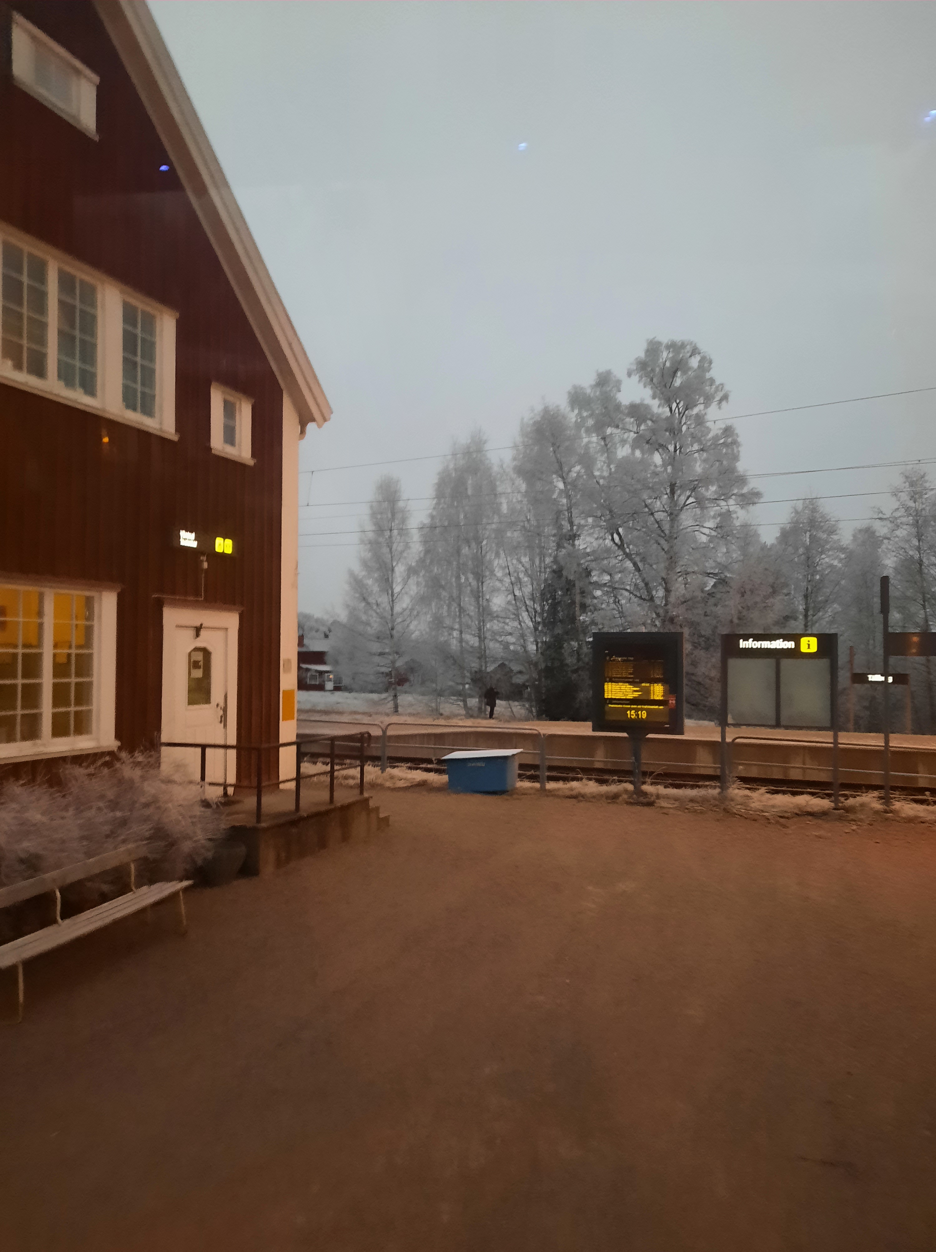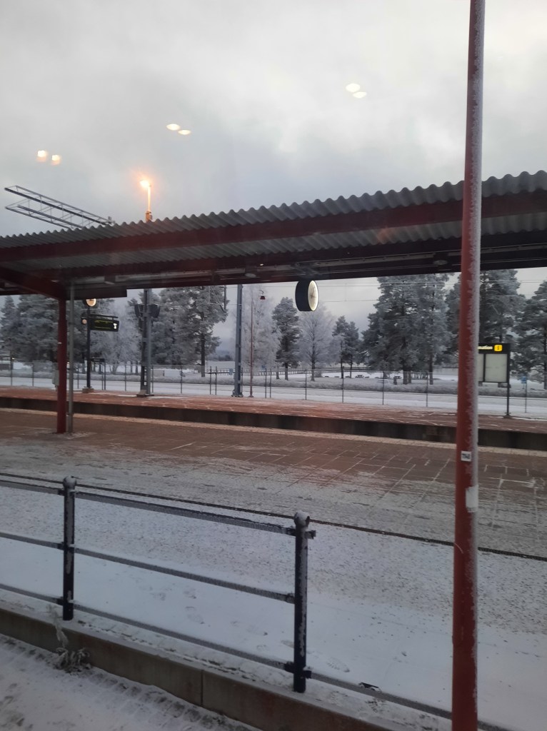 Nou, zo gaat het meestal dus. Vandaag, 30 november, mag ik weer ontdekken wat er  gebeurd als het niet zo loopt als gepland. Vandaag ga ik niet direkt vanuit het werk maar eerst nog naar huis. Scheelt me een half uur denk ik nog opgewekt. Terwijl ik thuis mijn tas pak krijg van SJ ( de zweedse NS) een sms. Storing op het spoor dus er rijden geen treinen op het eerste deel van mijn traject. Ze denken nog na over vervangend vervoer. Na een tijdje wachten krijg ik door dat er een bus is geregeld, 20 min na de orginele vertrektijd. Ik laat me toch wat eerder naar het station brengen waar kind 1 mij ontmoet om samen koffie te drinken. Als ik de tijden weer check zie ik plots dat de bus toch op de orginele tijd komt, giet mijn koffie naar binnen en loop gehaast naar de bushalte. Waar ik vervolgens toch nog de hele 20 min moet wachten, de tijd is weer aangepast. Mijn lijf is nog niet helemaal gewend aan de -12 die het vandaag is, dus bevroren stap ik in de bus. Vanaf daar gaat het uiteindelijk zonder problemen, maar al met al duurt de reis langer wat betekent dat in de plaats van rond half 7, om half negen uitgeput mijn kamer binnen stap. Na een kleine paniekaanval toen het automatisch inchecken verkeerd liep en het even leek dat ik ter plekke zelf de kamer mocht betalen. Gelukkig bestaan er nog aardige mensen die hier werken en is niet alles een computer. En nu? Bijkomen, eten en ontbijt boeken. Morgen mag ik weer terug. Met de trein.