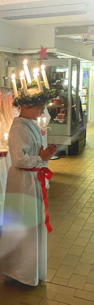 Gisteren had onze zoon al een viering in het dorpshuis, vandaag mochten zij optreden op school en zelfs in de winkel in het dorp. Voor elke viering was er een ander kind uitgeloot. In de de winkel was het de beurt aan onze zoon. Daar waar het landelijk al tot wat ophef heeft geleid, een jongen kon volgens enkelen geen Lucia zijn, was er hier niemand in de klas die de keuze in twijfel nam. En zo stond ik dan vanochtend als trotse moeder te kijken naar mijn zoon als een prachtige Lucia.